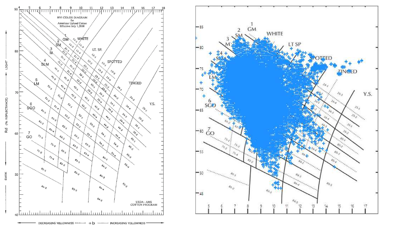 Superposición del grado de color (reflectancia – amarillez), en el diagrama de grados de color (Nickerson – Hunter) en base a 40.000 resultados representados con una cruz azul.