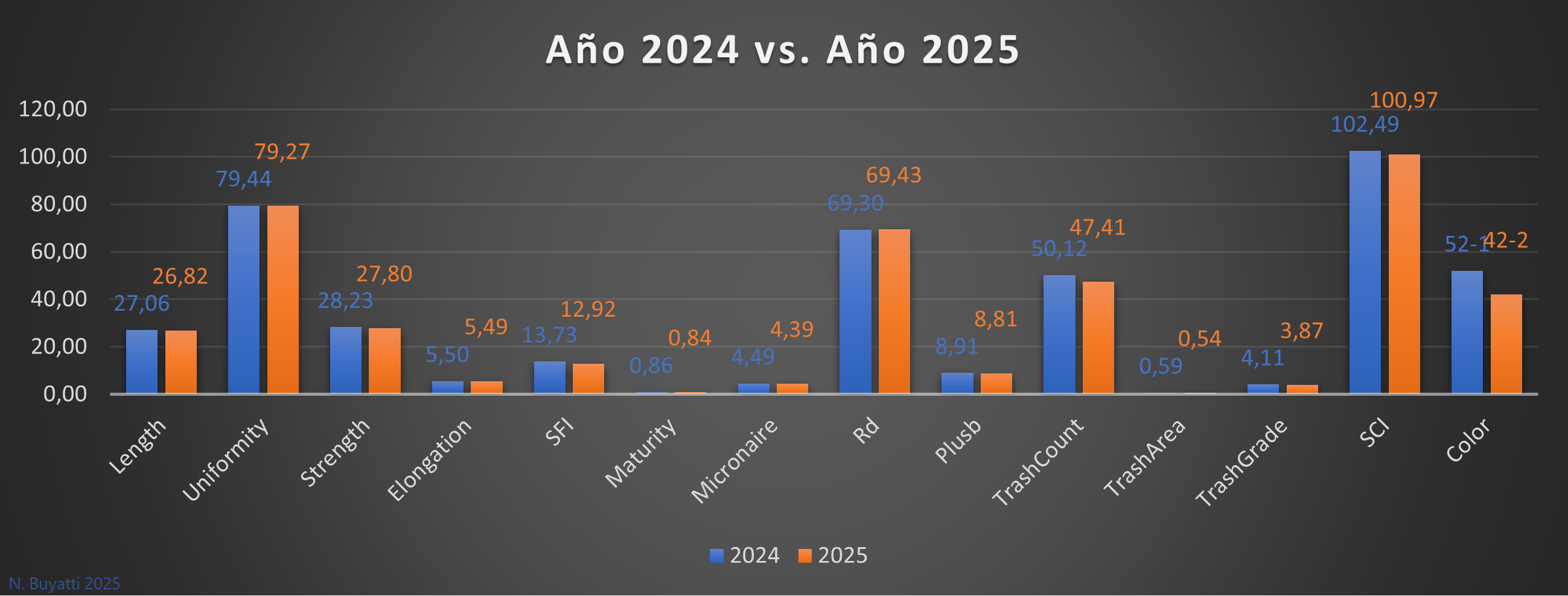En esta campaña las calidades de fibra obtenidas oscilaron en una media entre el grado Strict Low Middling (SLM) y Low Middling (LM) dependiendo la procedencia; calidades inferiores a lo usual debido a las condiciones climáticas en las distintas zonas del país que fueron afectadas nuevamente por períodos de stress térmico. Adicionalmente, se obtuvieron elevados índices de amarillamiento localizado (alteraciones cromáticas asociadas a exposición a radiación UV), contaminación vegetal y contenido de materia extraña, fundamentalmente corteza.